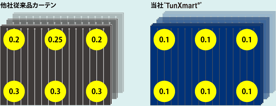 他社従来品カーテン0.2~0.3μSv、当社タングステンカーテン0.1μSv